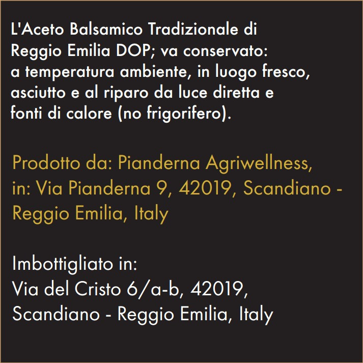 L'Aceto Tradizionale di Reggio Emilia DOP Oro è la massima espressione dell'arte acetiera emiliana. Invecchiato per oltre 25 anni, offre un complesso bouquet di aromi e un sapore straordinariamente ricco, dove dolcezza e acidità si armonizzano perfettamente. Denso, vibrante e persistente, esalta il Parmigiano Reggiano, le fragole o il gelato alla vaniglia, trasformando ogni abbinamento in un'esperienza sensoriale unica. Un capolavoro gastronomico che incarna la storia e la raffinatezza dell'Emilia-Romagna.